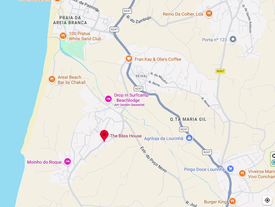 The Bliss House ist ideal zwischen Lissabon und Nazaré gelegen. Etwa eine Autostunde bzw. 67 km vom Flughafen Lissabon entfernt. Die Fahrzeit ab dem Flughafen Porto beträgt etwa 3 Std.
