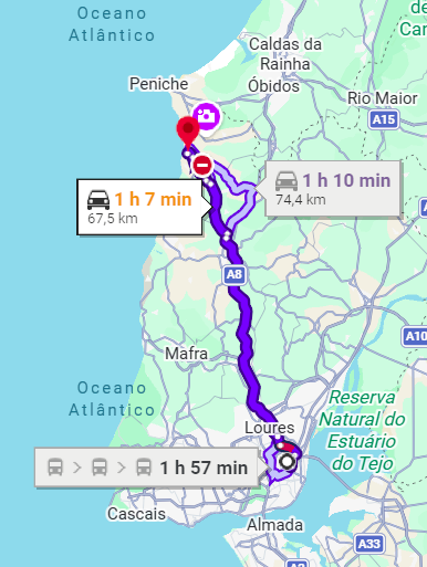 Sie erreichen The Bliss House am bequemsten mit dem PKW. Es gibt auch eine Busverbindung Lissabon – Peniche. Die nächstgelegene Haltestelle befindet sich im Nachbardorf, Praia da Areia Branca., ca. 25 min. Fußweg entfernt.